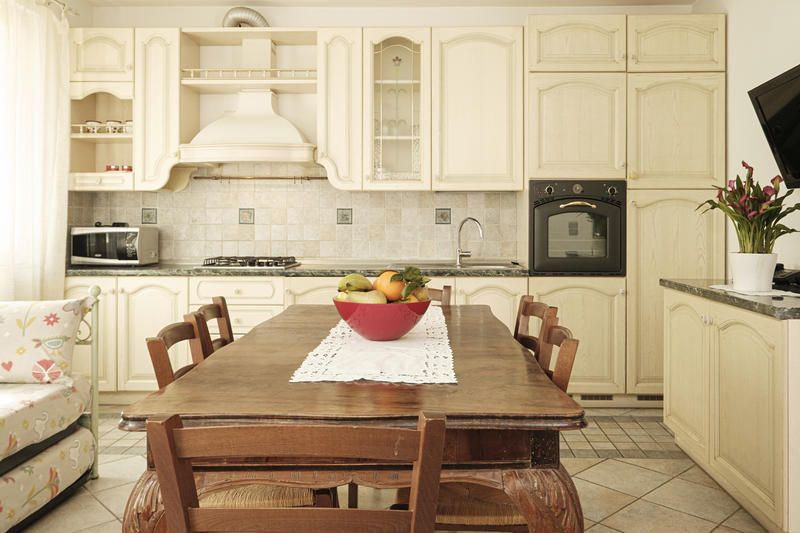 В кухне-гостиной имеется диван. На площадке перед домом - зонт, стол и стулья.